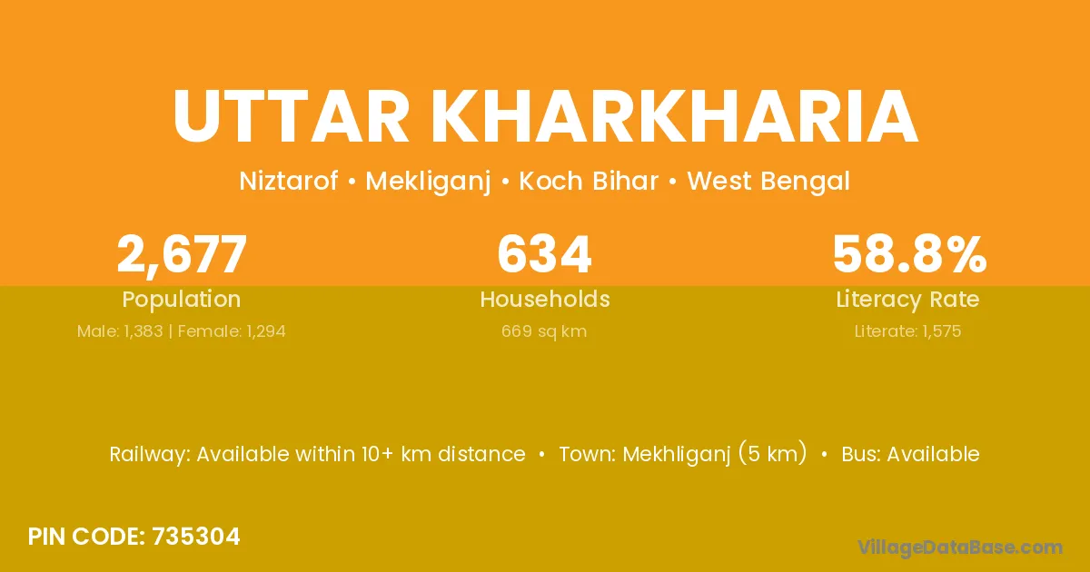 Mekhliganj (5 km) is the nearest town to Uttar Kharkharia village for major economic activities and is located approximately 5 km away.
