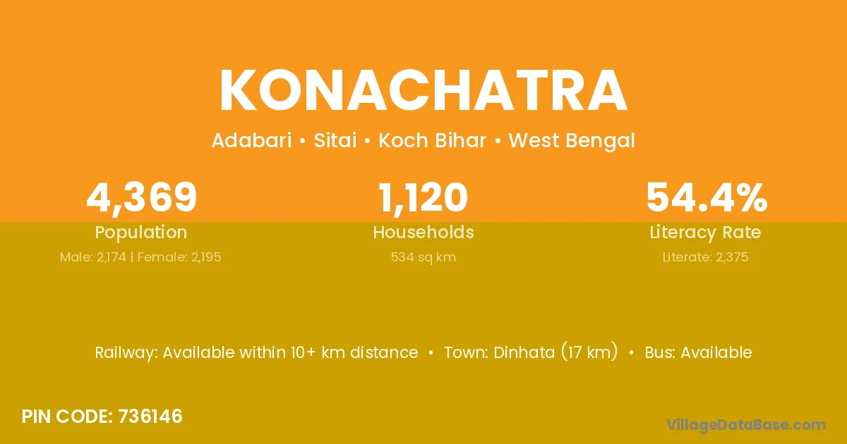 Dinhata (17 km) is the nearest town to Konachatra village for major economic activities and is located approximately 17 km away.