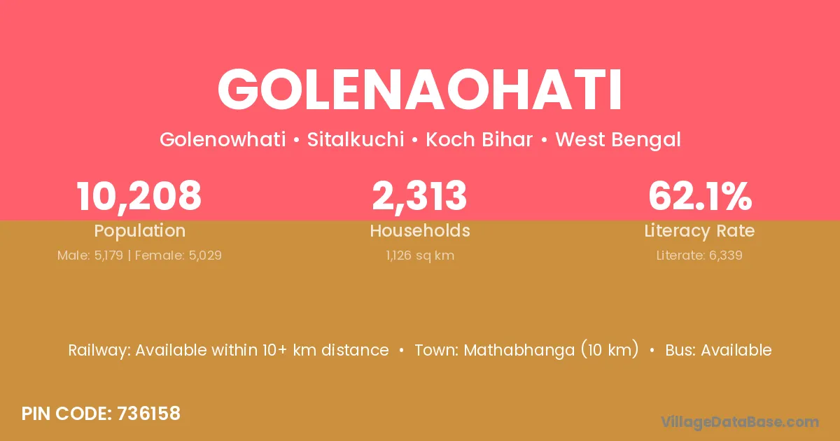 Mathabhanga (10 km) is the nearest town to Golenaohati village for major economic activities and is located approximately 10 km away.