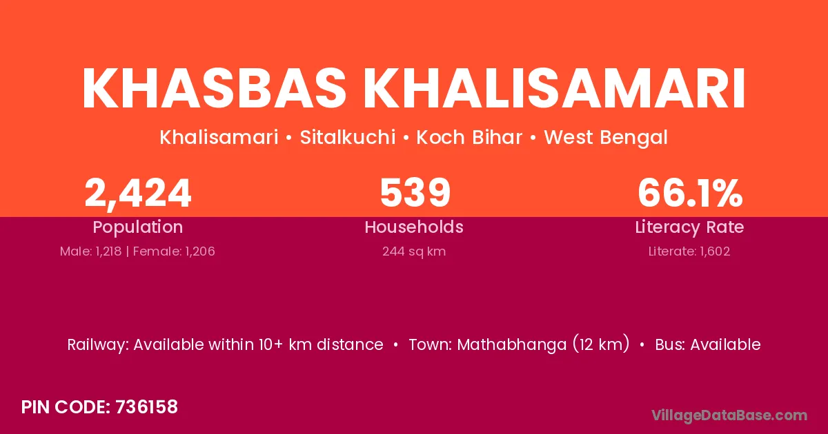 Mathabhanga (12 km) is the nearest town to Khasbas Khalisamari village for major economic activities and is located approximately 12 km away.