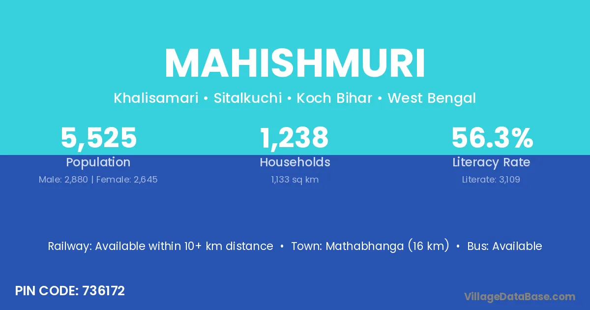Mathabhanga (16 km) is the nearest town to Mahishmuri village for major economic activities and is located approximately 16 km away.