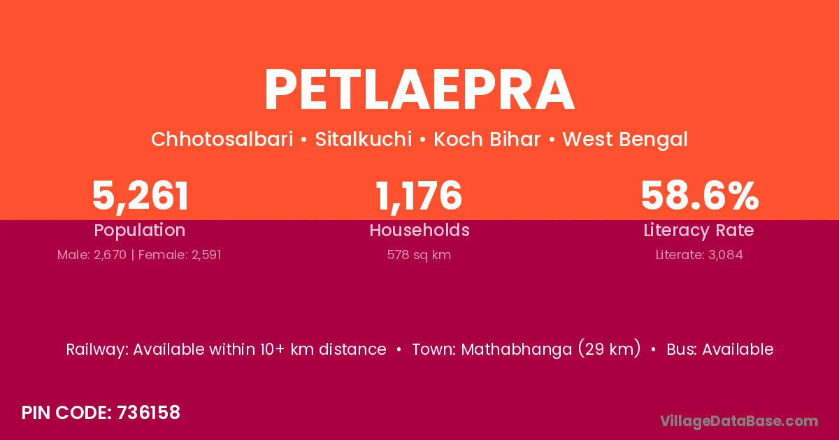 Mathabhanga (29 km) is the nearest town to Petlaepra village for major economic activities and is located approximately 29 km away.