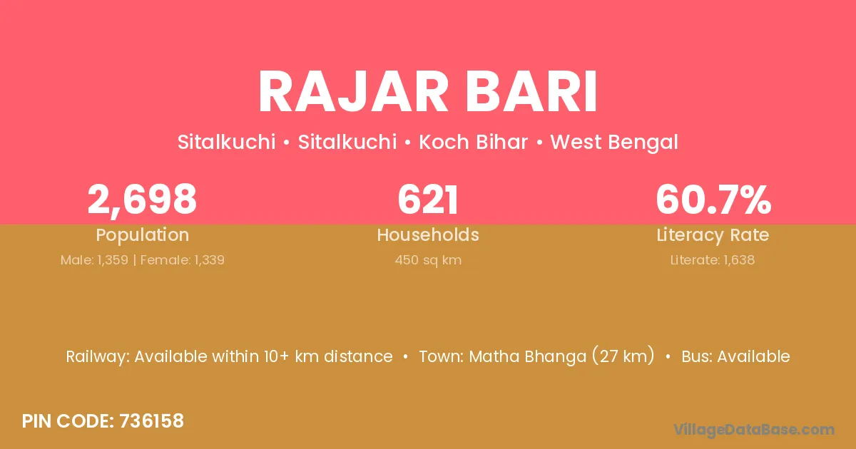 Matha Bhanga (27 km) is the nearest town to Rajar Bari village for major economic activities and is located approximately 27 km away.