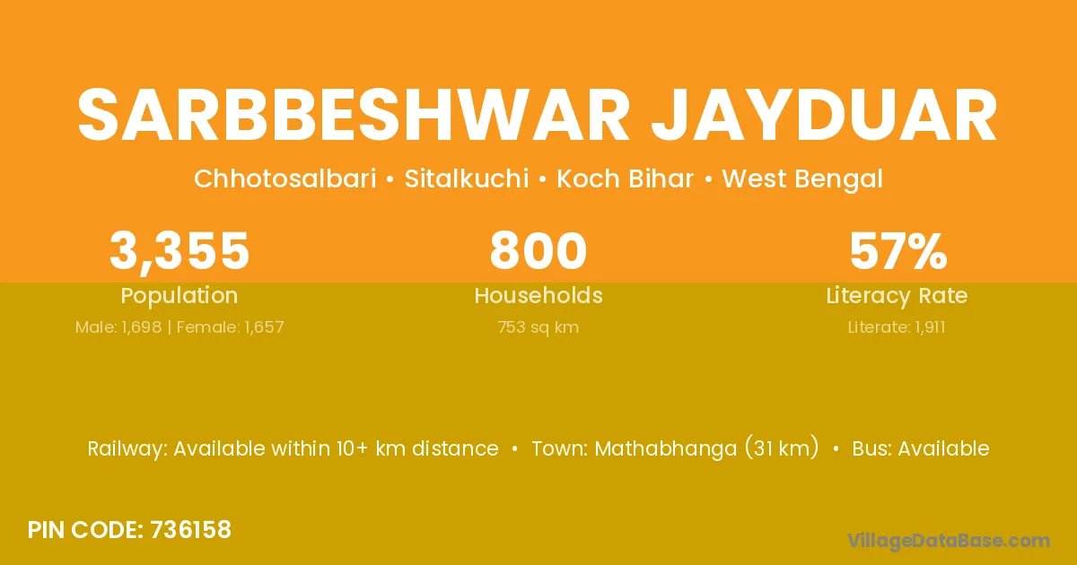 Mathabhanga (31 km) is the nearest town to Sarbbeshwar Jayduar village for major economic activities and is located approximately 31 km away.