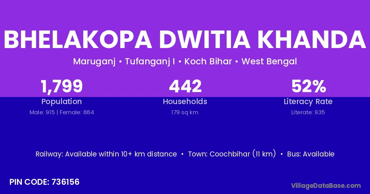 Coochbihar (11 km) is the nearest town to Bhelakopa Dwitia Khanda village for major economic activities and is located approximately 11 km away.