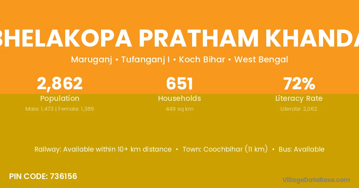 Coochbihar (11 km) is the nearest town to Bhelakopa Pratham Khanda village for major economic activities and is located approximately 11 km away.
