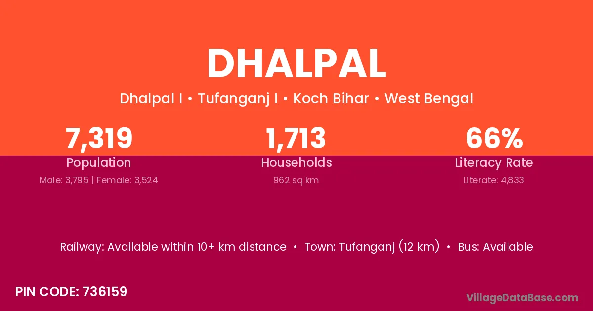 Tufanganj (12 km) is the nearest town to Dhalpal village for major economic activities and is located approximately 12 km away.