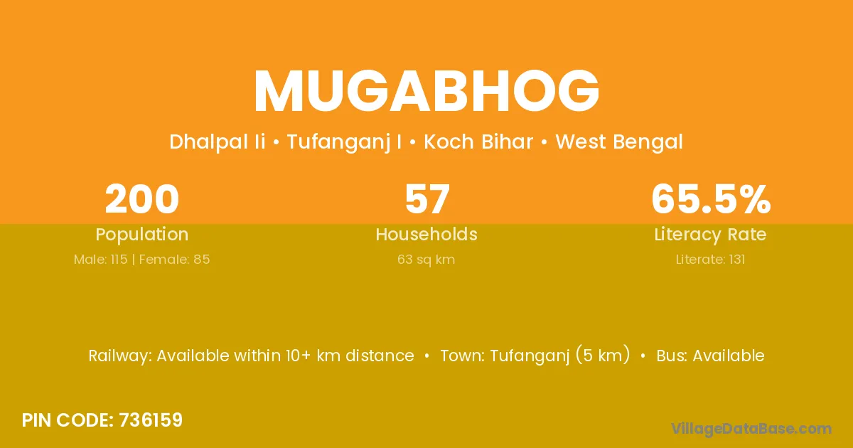 Tufanganj (5 km) is the nearest town to Mugabhog village for major economic activities and is located approximately 5 km away.