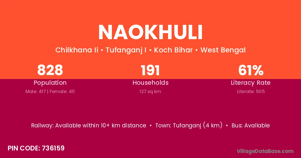 Tufanganj (4 km) is the nearest town to Naokhuli village for major economic activities and is located approximately 4 km away.