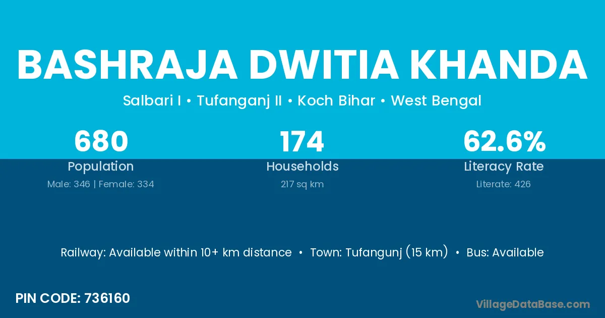 Tufangunj (15 km) is the nearest town to Bashraja Dwitia Khanda village for major economic activities and is located approximately 15 km away.