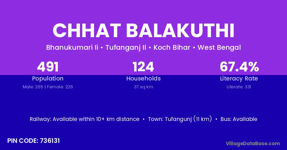 Tufangunj (11 km) is the nearest town to Chhat Balakuthi village for major economic activities and is located approximately 11 km away.