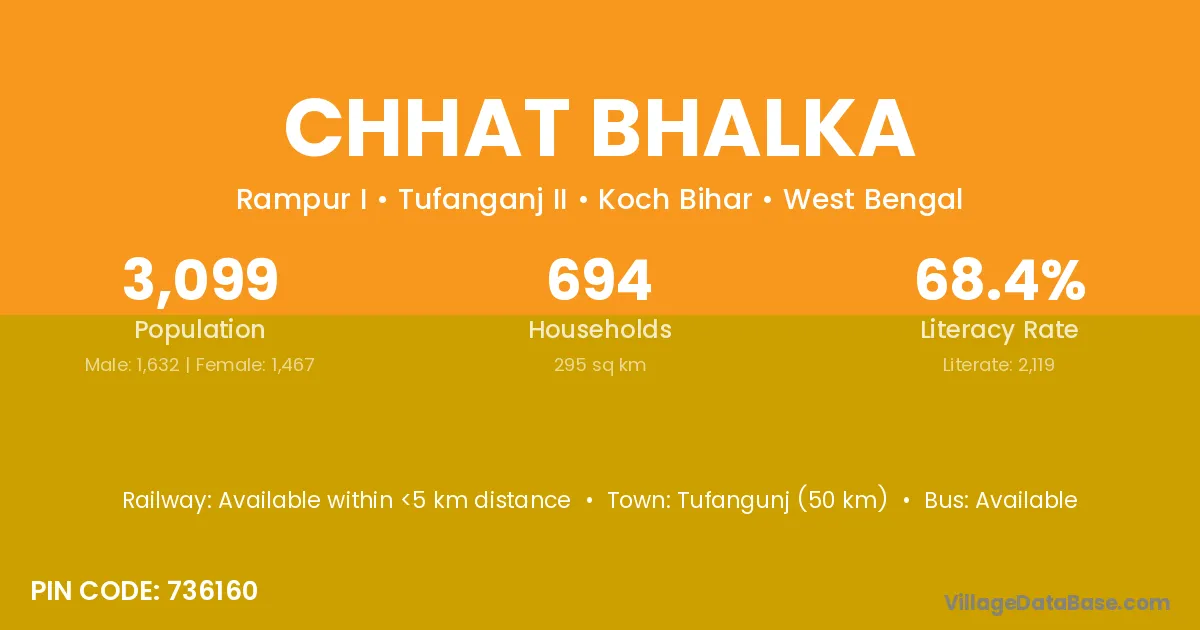 Tufangunj (50 km) is the nearest town to Chhat Bhalka village for major economic activities and is located approximately 50 km away.