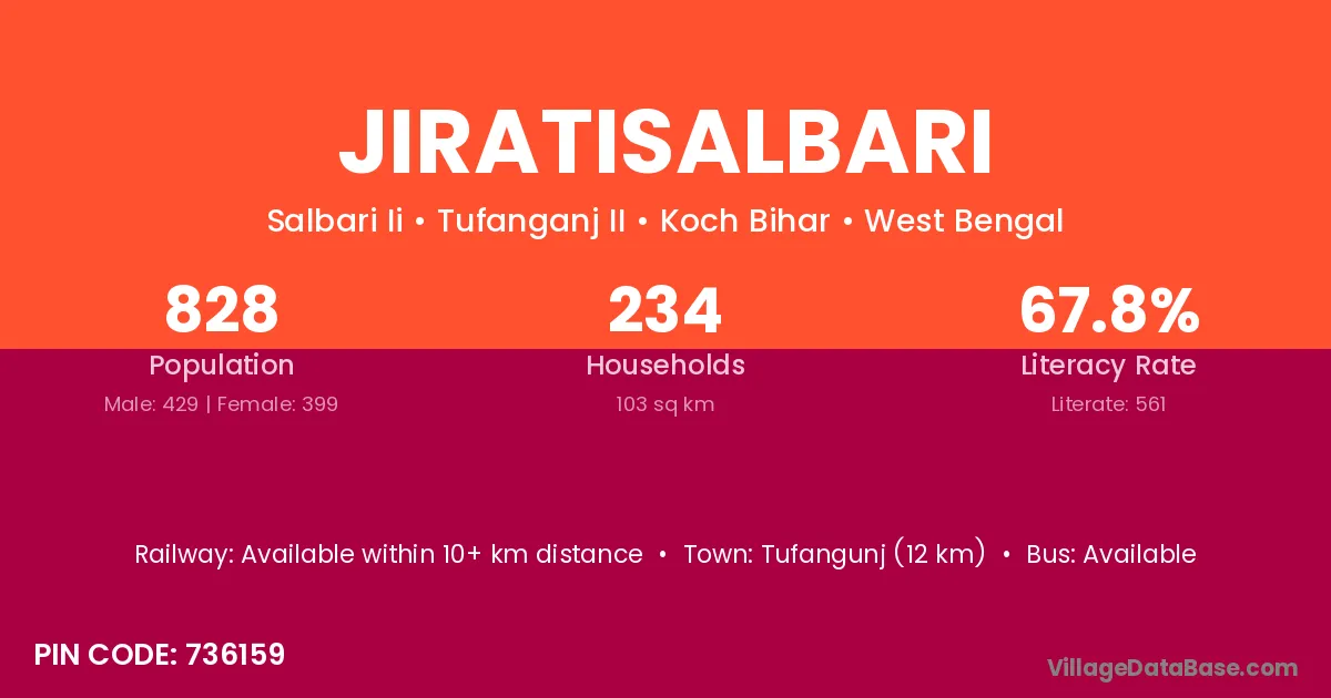 Tufangunj (12 km) is the nearest town to Jiratisalbari village for major economic activities and is located approximately 12 km away.