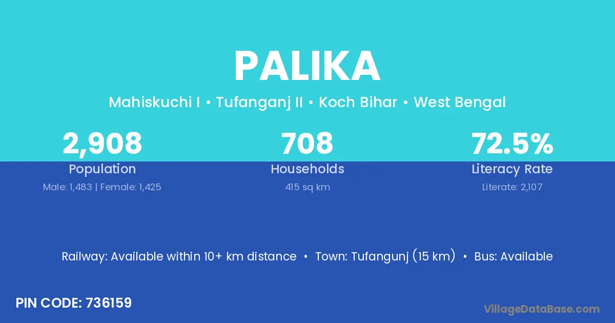 Tufangunj (15 km) is the nearest town to Palika village for major economic activities and is located approximately 15 km away.