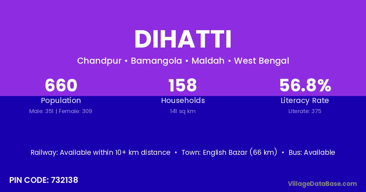 English Bazar (66 km) is the nearest town to Dihatti village for major economic activities and is located approximately 66 km away.