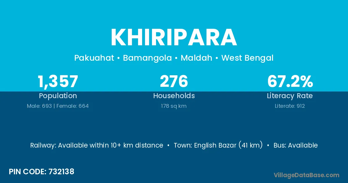 English Bazar (41 km) is the nearest town to Khiripara village for major economic activities and is located approximately 41 km away.