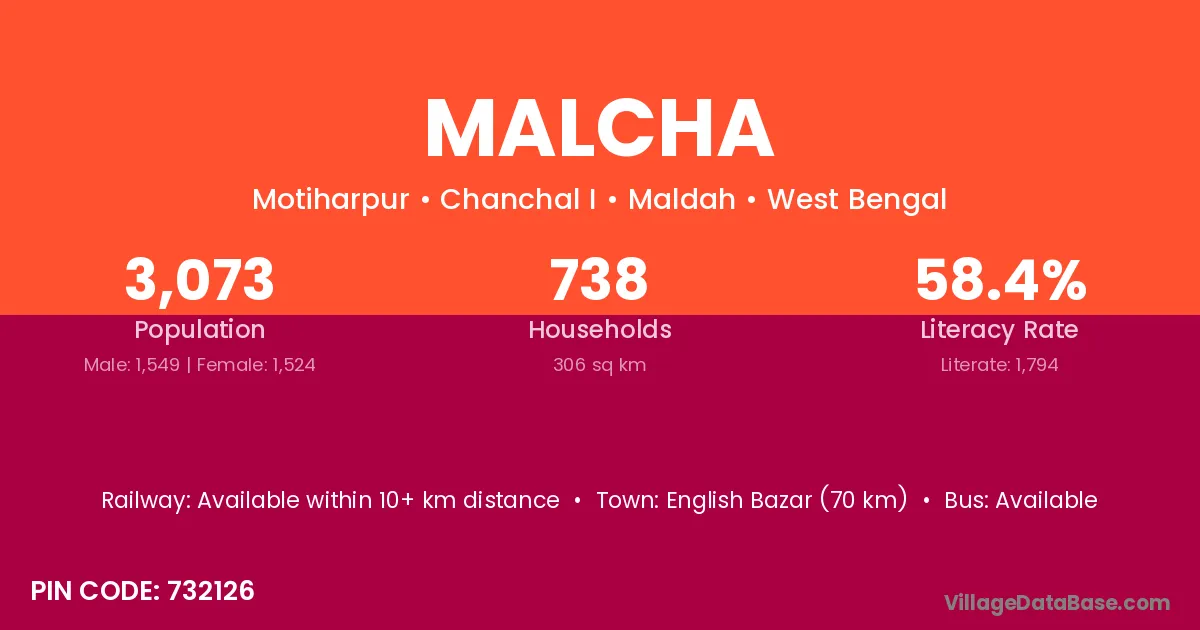 Malcha village is located in the Chanchal I Subdivision of the Maldah district in West Bengal.