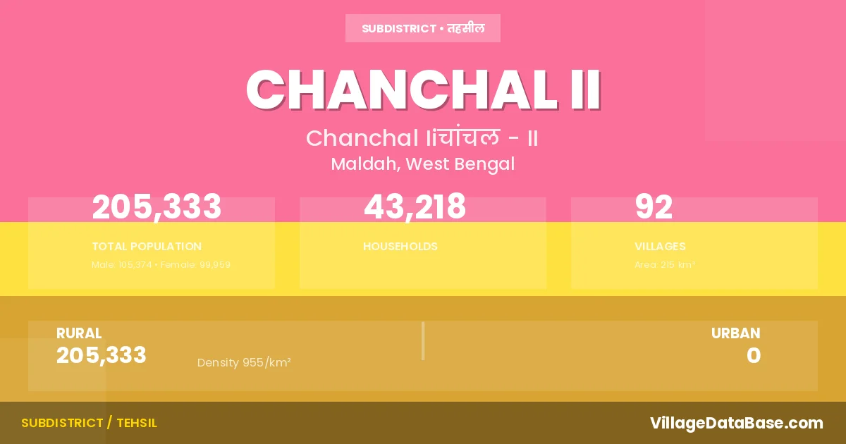 According to the 2011 census The total area of Chanchal II Subdivision is 215 km², with a population of 205333 people. The population density is 955 inhabitants per square kilometre, and there are approximately 43218 houses in the sub district.