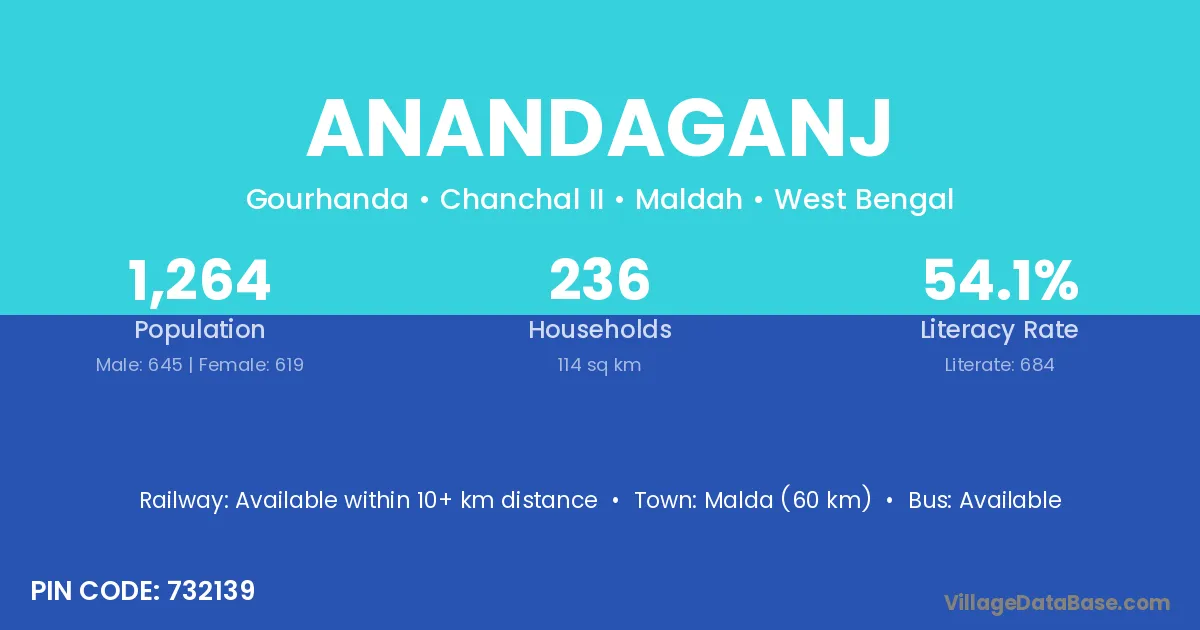 Malda (60 km) is the nearest town to Anandaganj village for major economic activities and is located approximately 60 km away.