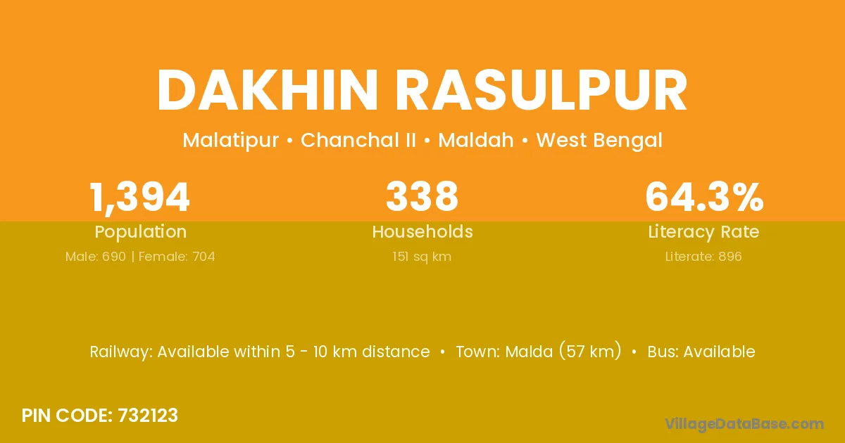 Malda (57 km) is the nearest town to Dakhin Rasulpur village for major economic activities and is located approximately 57 km away.