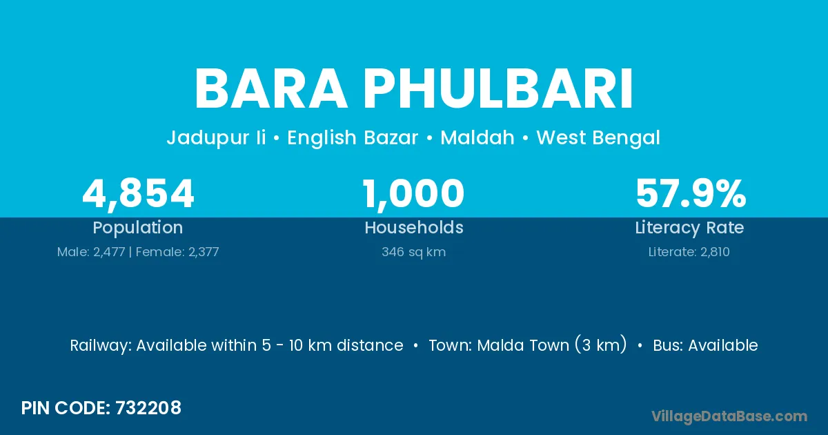 Malda Town (3 km) is the nearest town to Bara Phulbari village for major economic activities and is located approximately 3 km away.