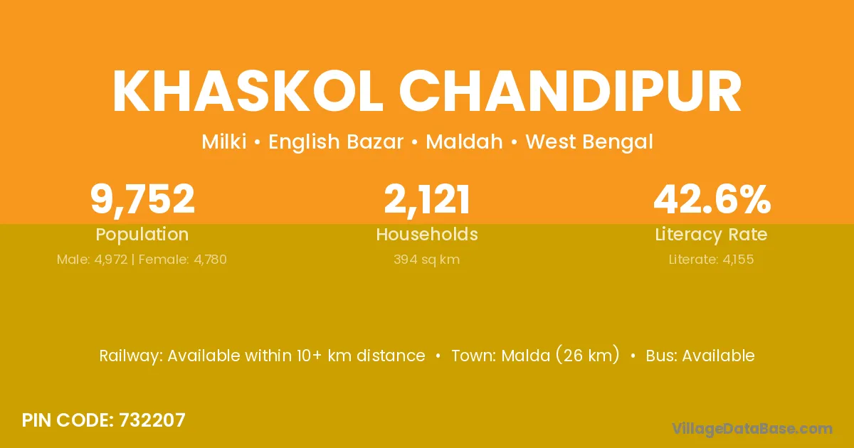 Malda (26 km) is the nearest town to Khaskol Chandipur village for major economic activities and is located approximately 26 km away.
