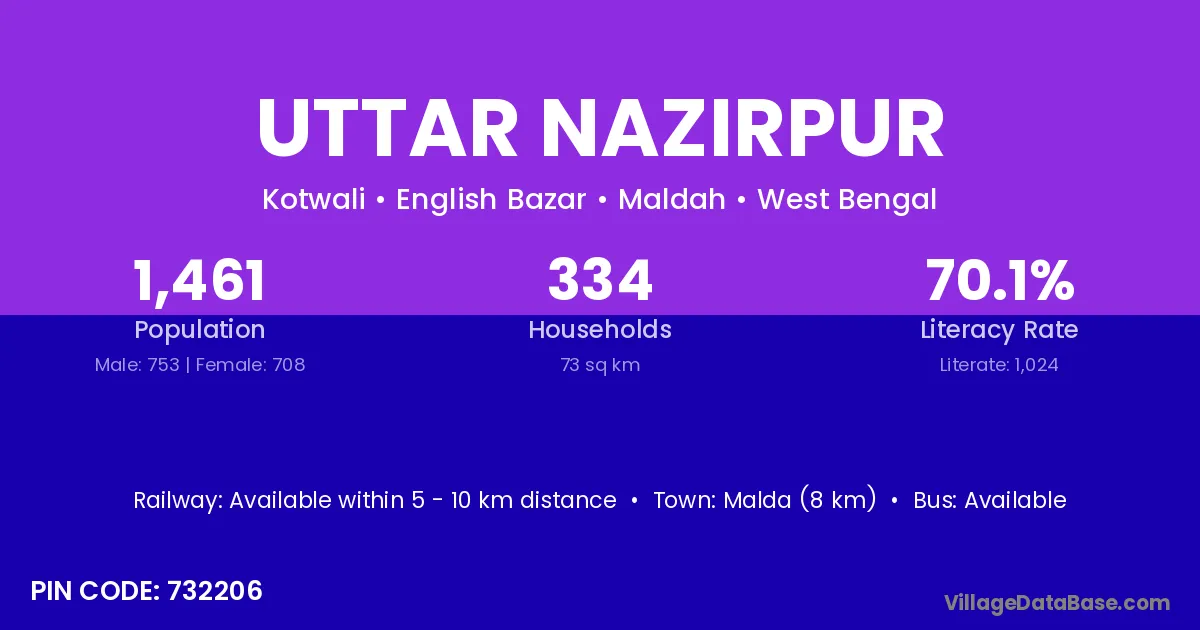Malda (8 km) is the nearest town to Uttar Nazirpur village for major economic activities and is located approximately 8 km away.