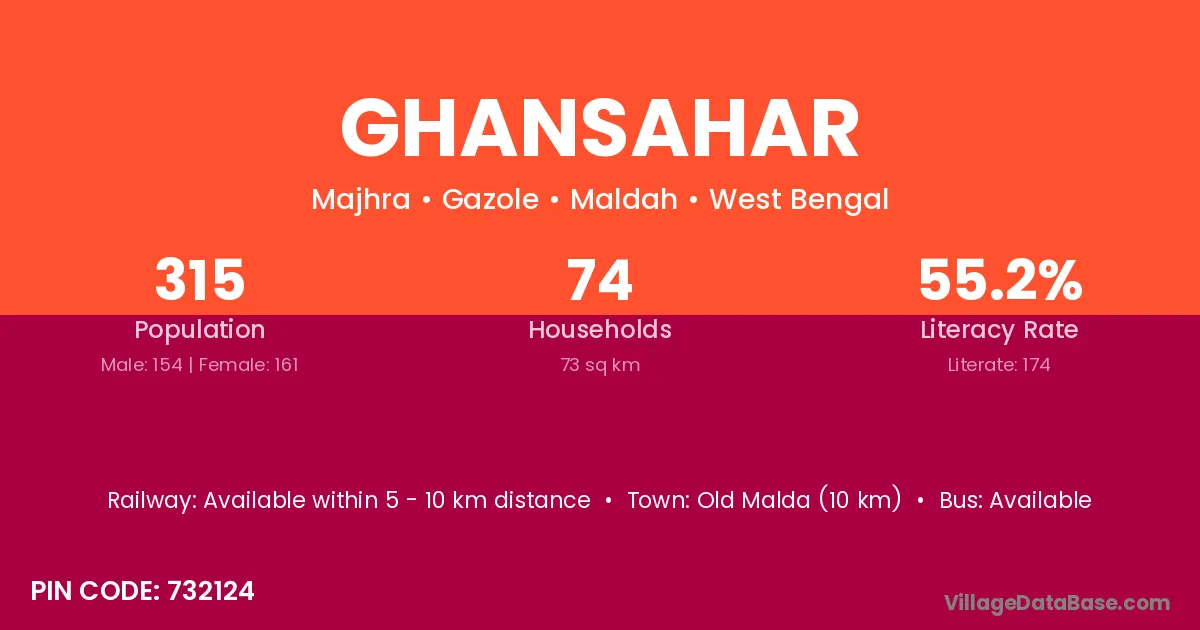 Old Malda (10 km) is the nearest town to Ghansahar village for major economic activities and is located approximately 10 km away.