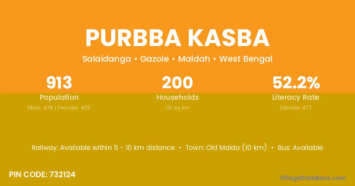 Old Malda (10 km) is the nearest town to Purbba Kasba village for major economic activities and is located approximately 10 km away.