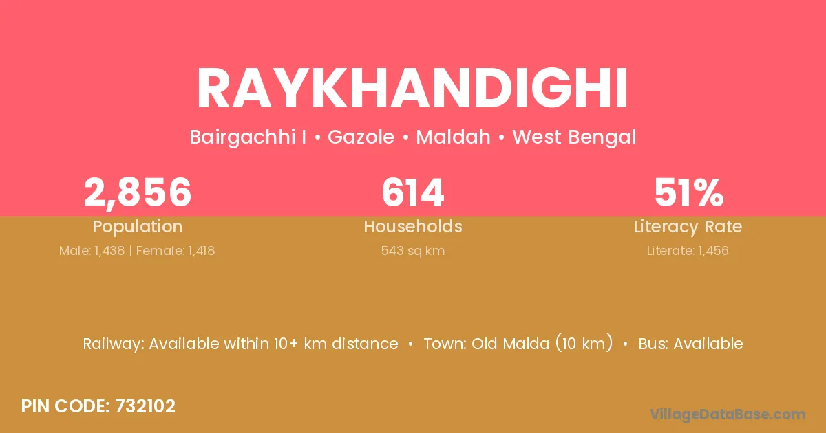 Old Malda (10 km) is the nearest town to Raykhandighi village for major economic activities and is located approximately 10 km away.
