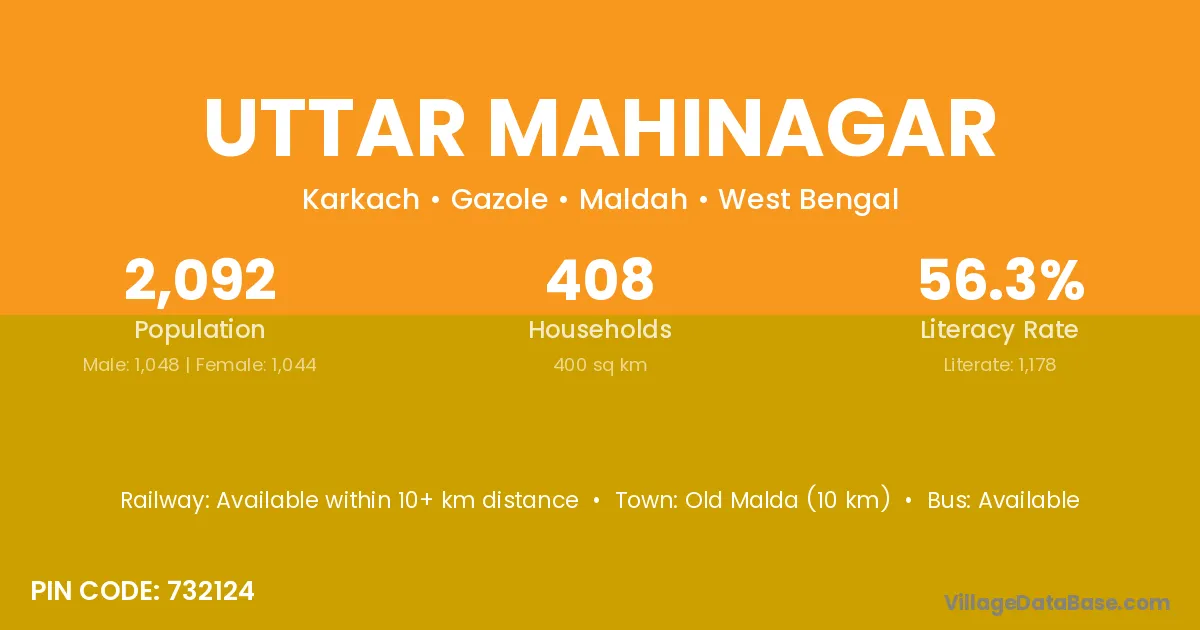Old Malda (10 km) is the nearest town to Uttar Mahinagar village for major economic activities and is located approximately 10 km away.