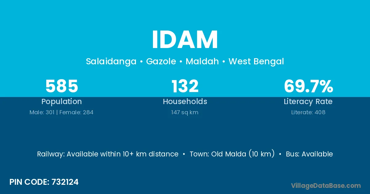 Old Malda (10 km) is the nearest town to Idam village for major economic activities and is located approximately 10 km away.