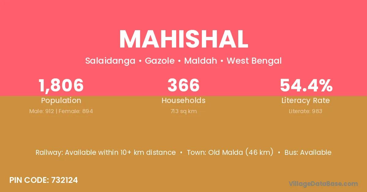 Old Malda (46 km) is the nearest town to Mahishal village for major economic activities and is located approximately 46 km away.