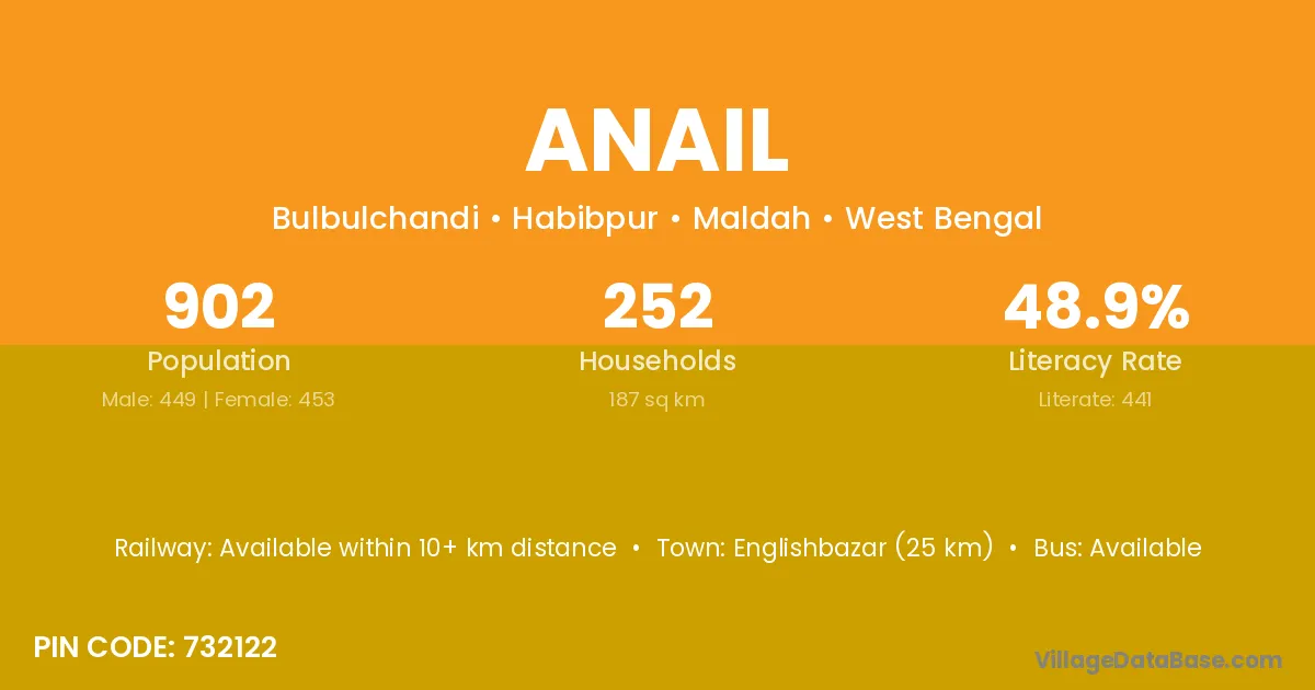 Anail village is located in the Habibpur Subdivision of the Maldah district in West Bengal.