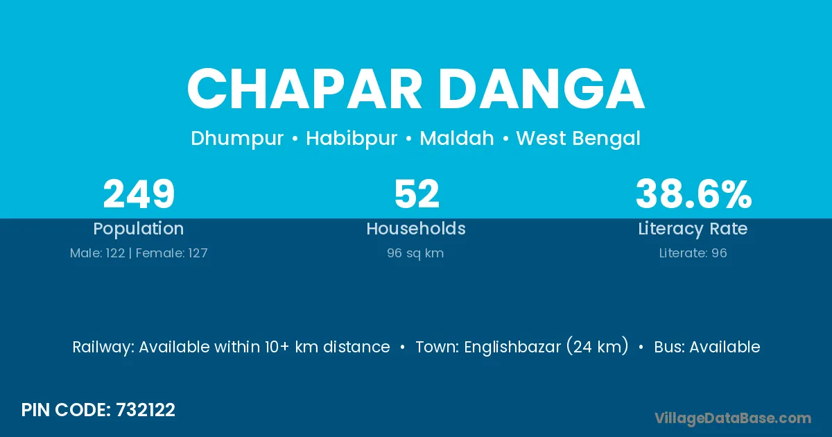 Englishbazar (24 km) is the nearest town to Chapar Danga village for major economic activities and is located approximately 24 km away.