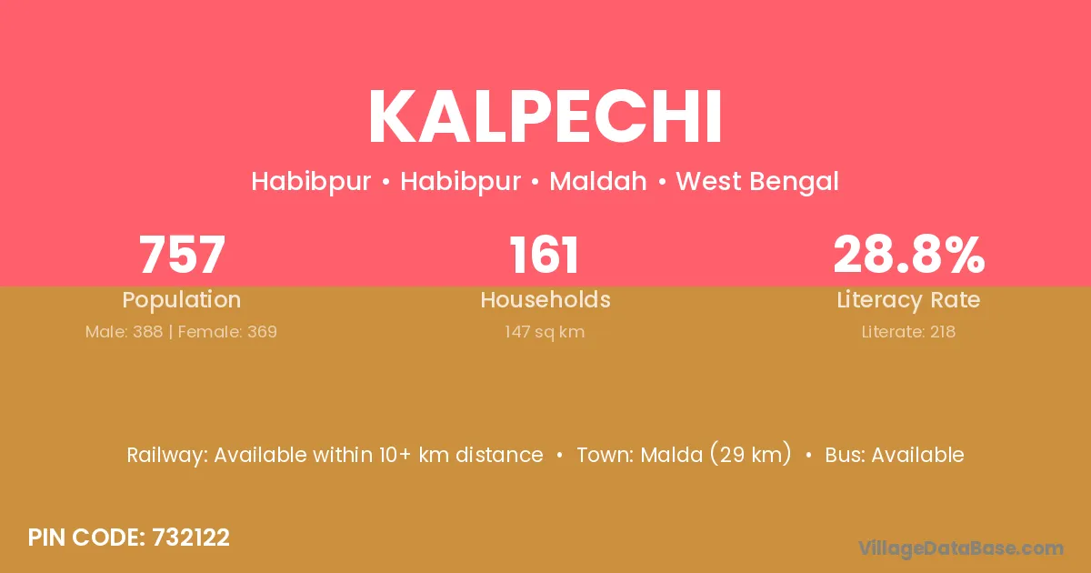 Malda (29 km) is the nearest town to Kalpechi village for major economic activities and is located approximately 29 km away.