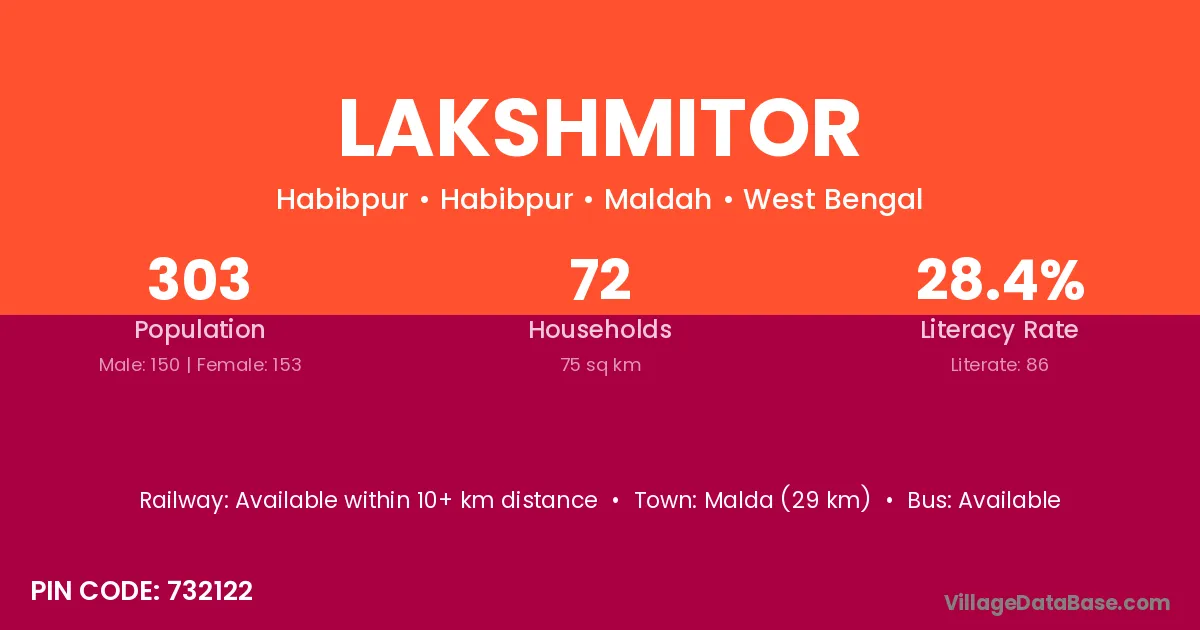 Malda (29 km) is the nearest town to Lakshmitor village for major economic activities and is located approximately 29 km away.
