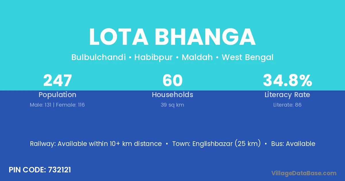 Englishbazar (25 km) is the nearest town to Lota Bhanga village for major economic activities and is located approximately 25 km away.