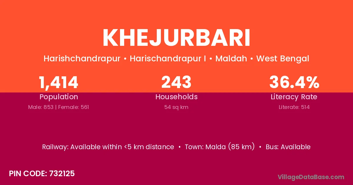 Malda (85 km) is the nearest town to Khejurbari village for major economic activities and is located approximately 85 km away.