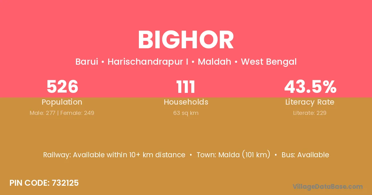 Malda (101 km) is the nearest town to Bighor village for major economic activities and is located approximately 101 km away.