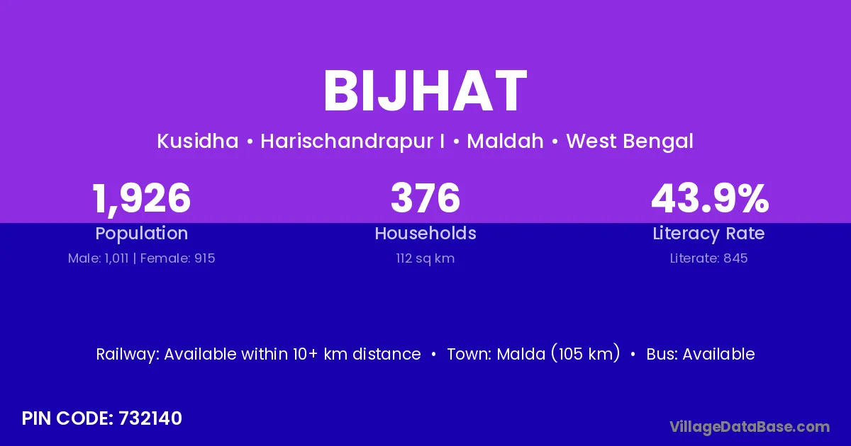 Malda (105 km) is the nearest town to Bijhat village for major economic activities and is located approximately 105 km away.