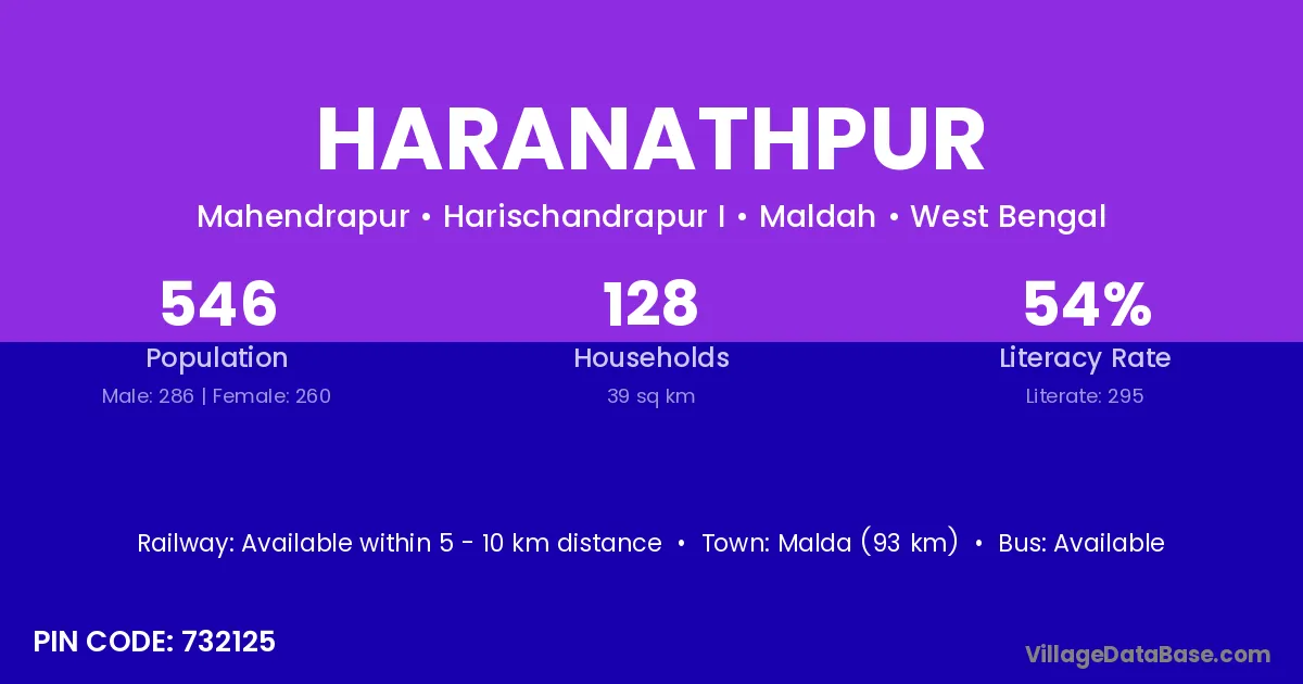 Malda (93 km) is the nearest town to Haranathpur village for major economic activities and is located approximately 93 km away.