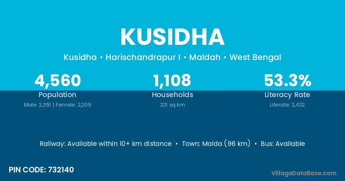 Malda (96 km) is the nearest town to Kusidha village for major economic activities and is located approximately 96 km away.