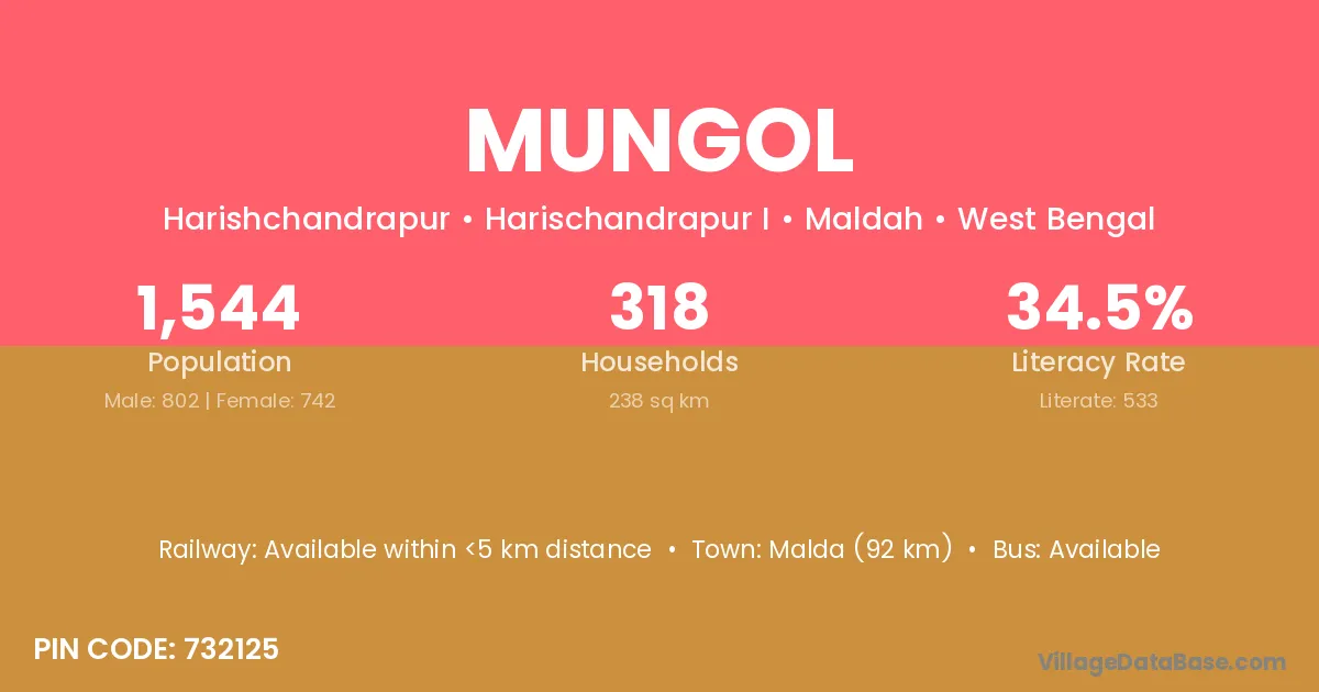 Malda (92 km) is the nearest town to Mungol village for major economic activities and is located approximately 92 km away.