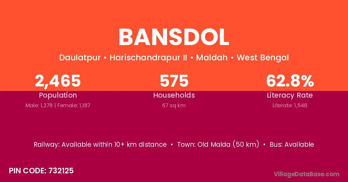 Old Malda (50 km) is the nearest town to Bansdol village for major economic activities and is located approximately 50 km away.