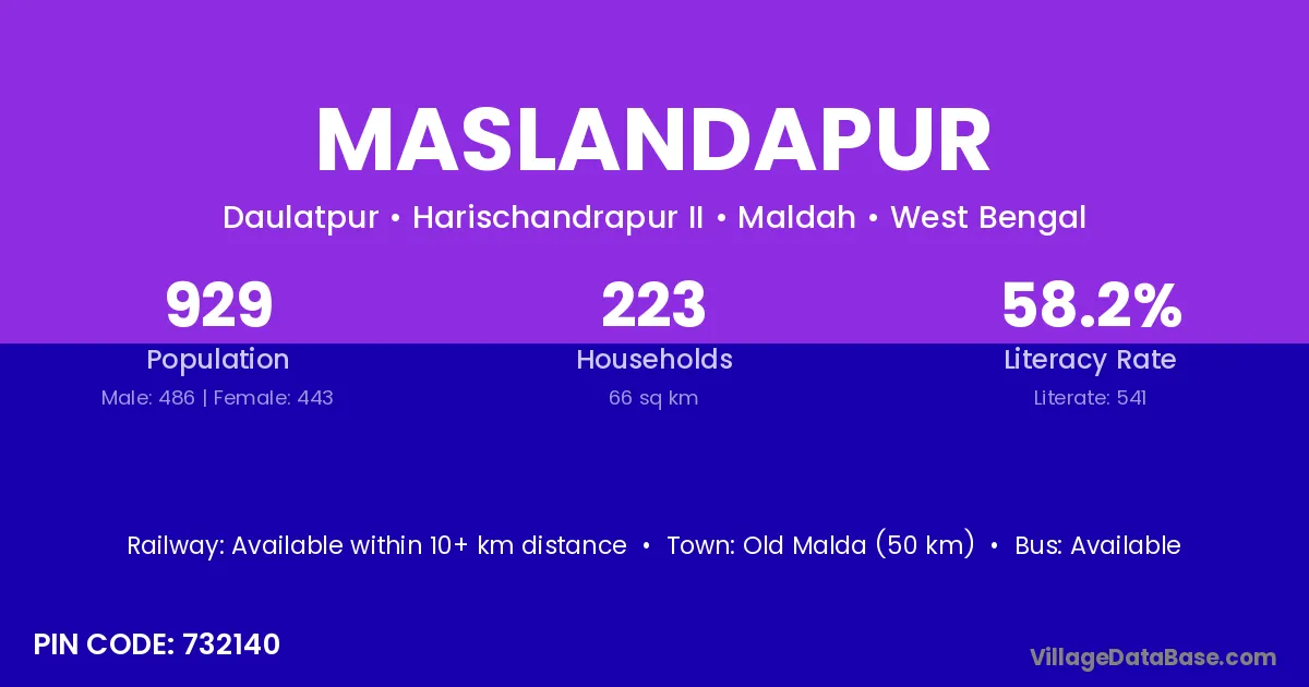 Old Malda (50 km) is the nearest town to Maslandapur village for major economic activities and is located approximately 50 km away.