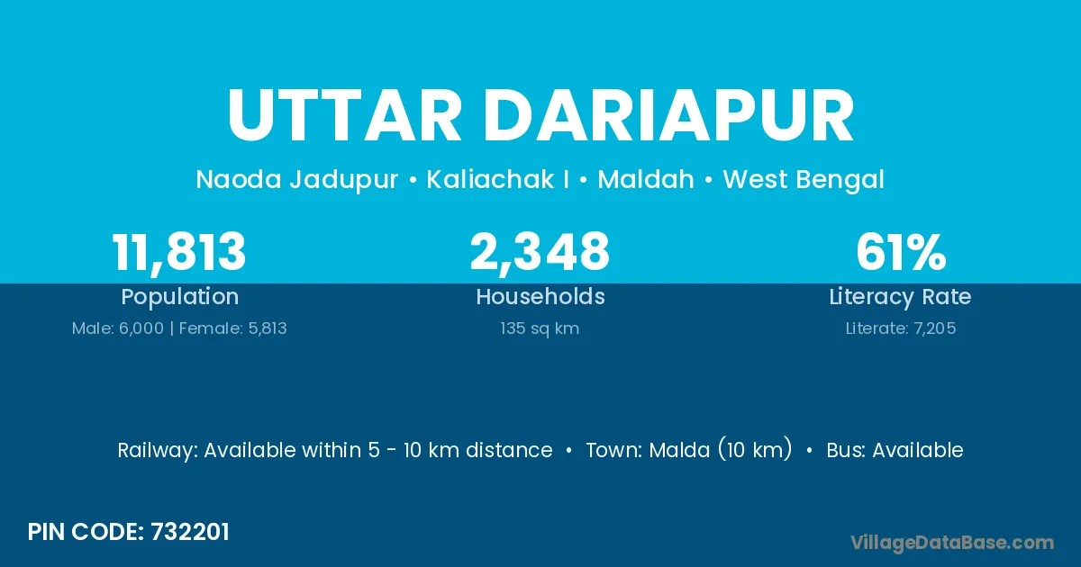 Malda (10 km) is the nearest town to Uttar Dariapur village for major economic activities and is located approximately 10 km away.