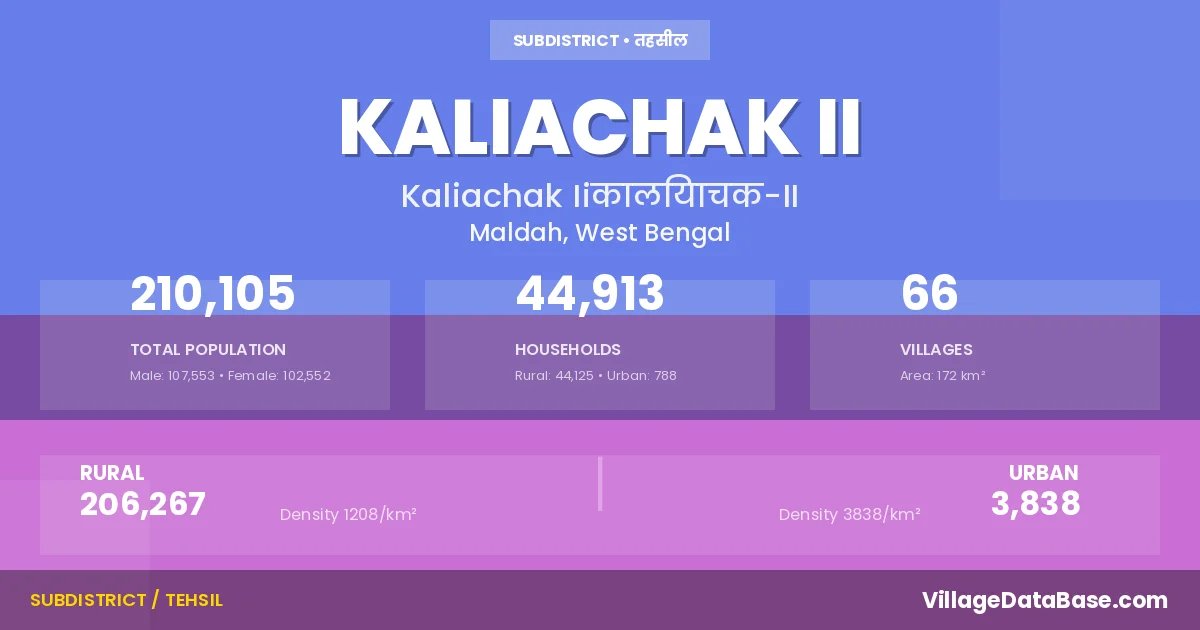 According to the 2011 census The total area of Kaliachak II Subdivision is 172 km², with a population of 210105 people. The population density is 1,223 inhabitants per square kilometre, and there are approximately 44913 houses in the sub district.