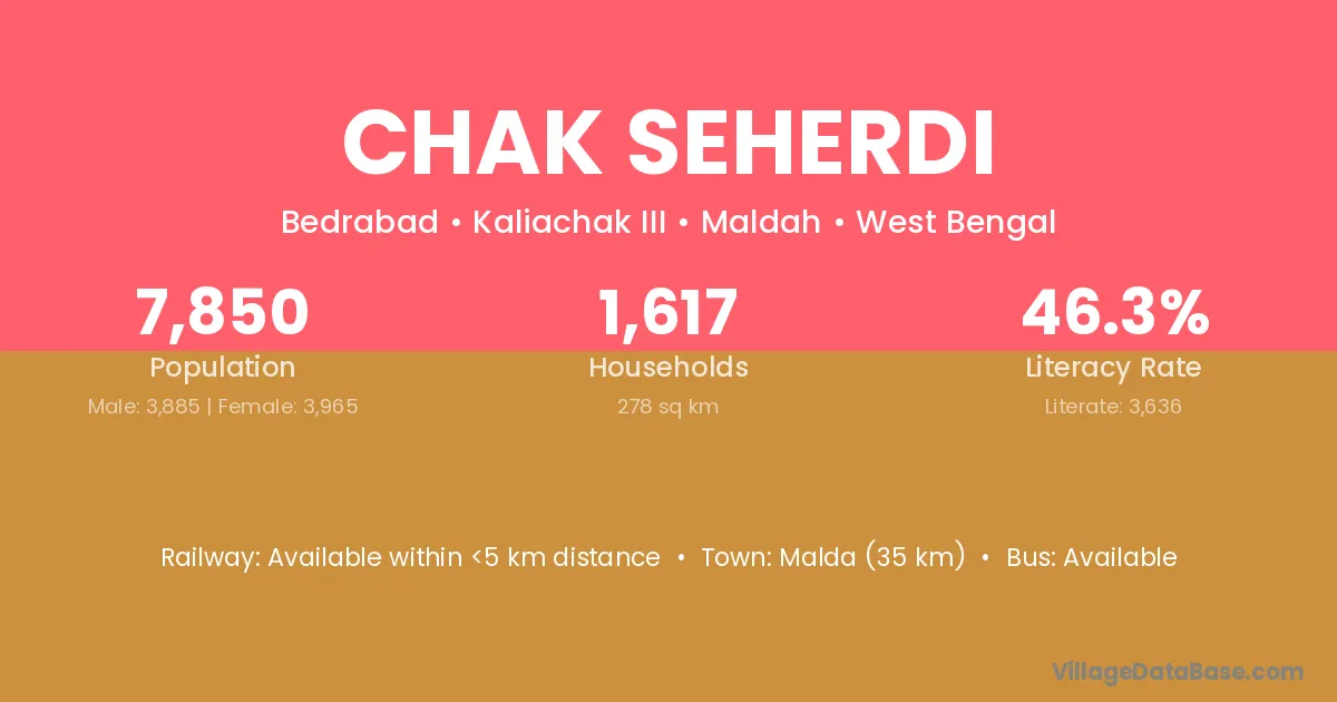 Malda (35 km) is the nearest town to Chak Seherdi village for major economic activities and is located approximately 35 km away.