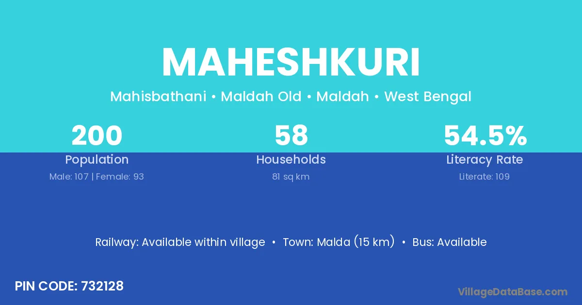 Malda (15 km) is the nearest town to Maheshkuri village for major economic activities and is located approximately 15 km away.